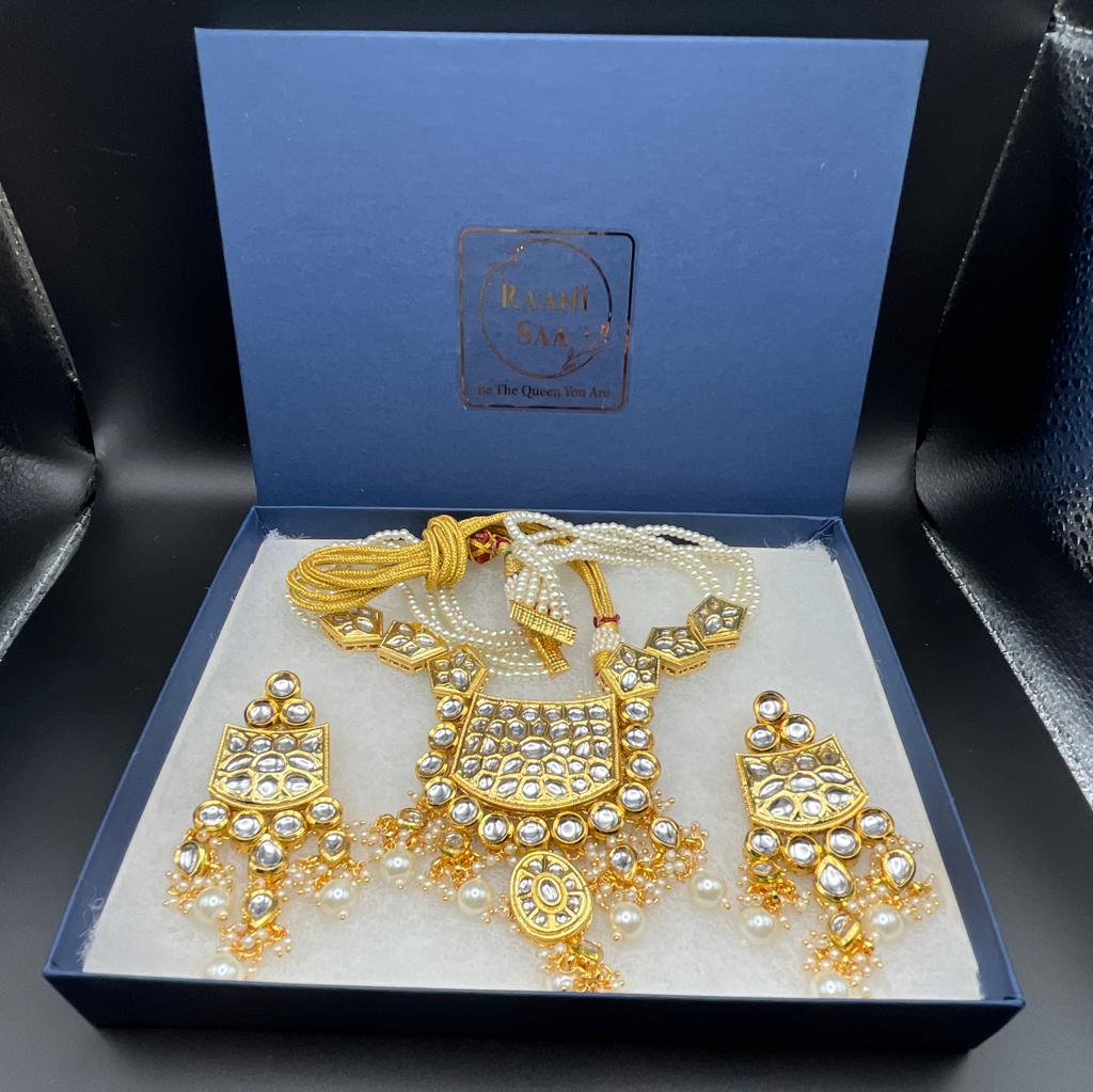 RJ- 003 Rani Haar with heavy pendant and matching heavy earrings in pure brass and kundan. Feel like royalty in this exquisite piece.
