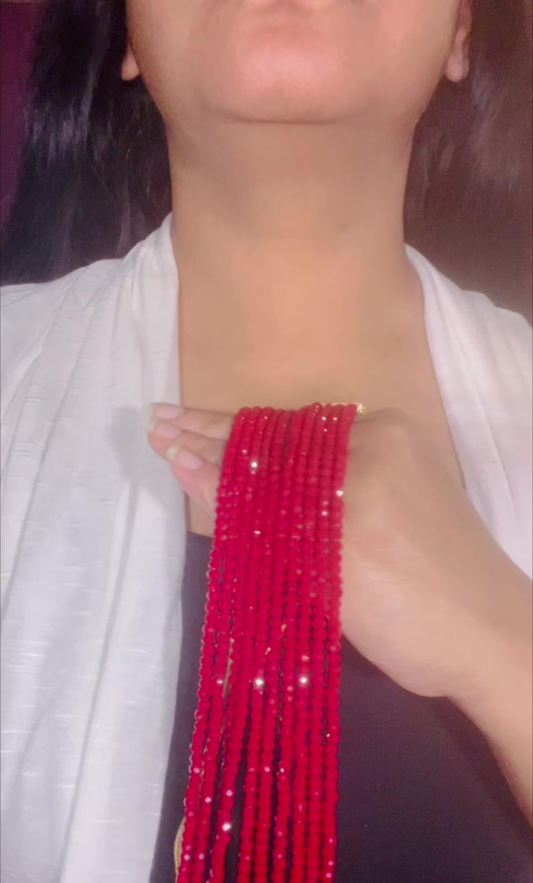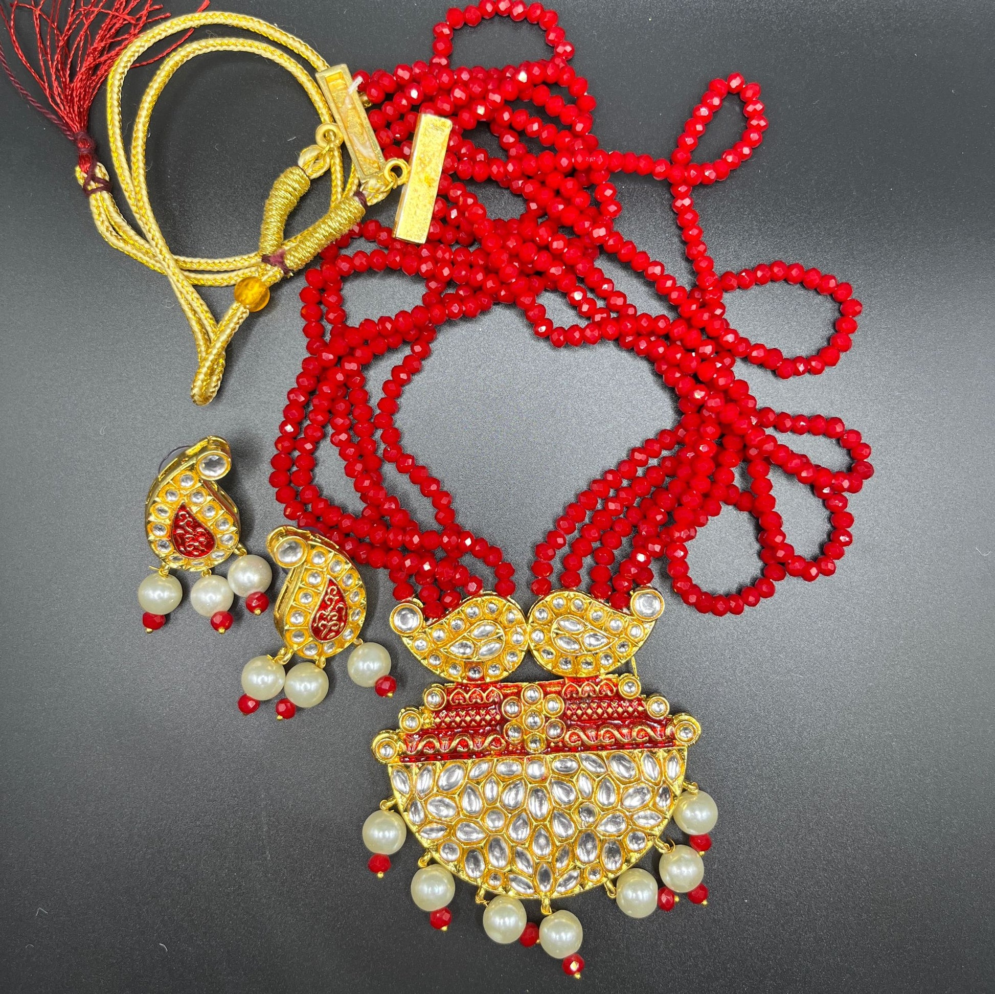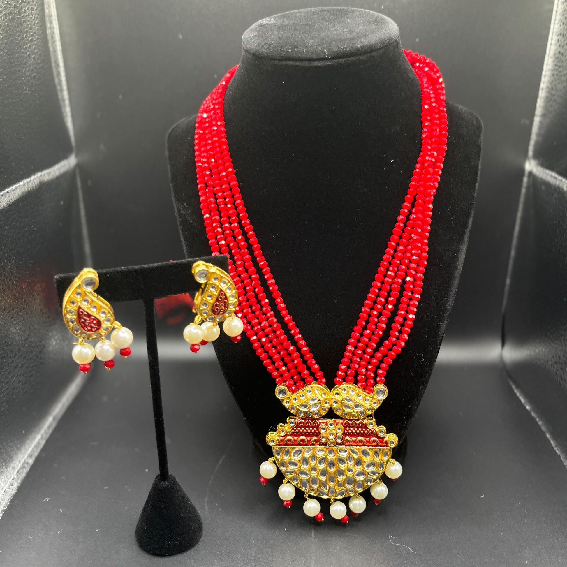 RJ- 005 Kundan pendant with 5 strings crystal mala and paisley earrings